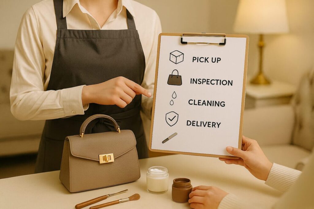 依頼者はまず画像を送ることで仮見積もりを受けられ、その後バッグを発送し、本見積もり、施工、納品までをすべて非対面で完結できます。